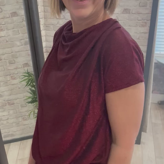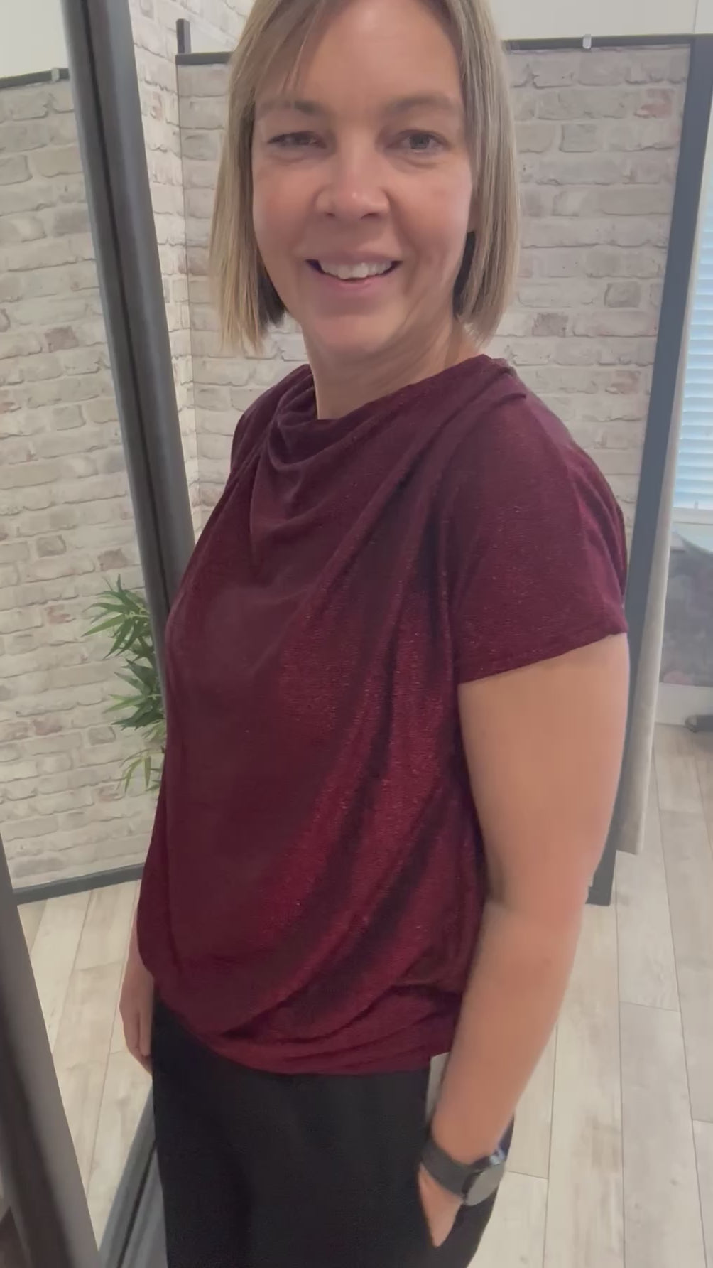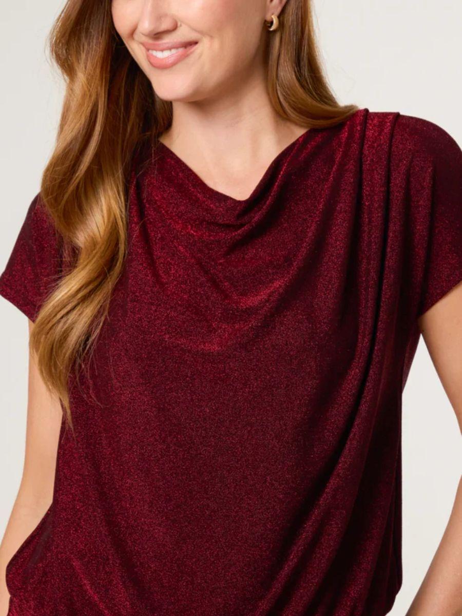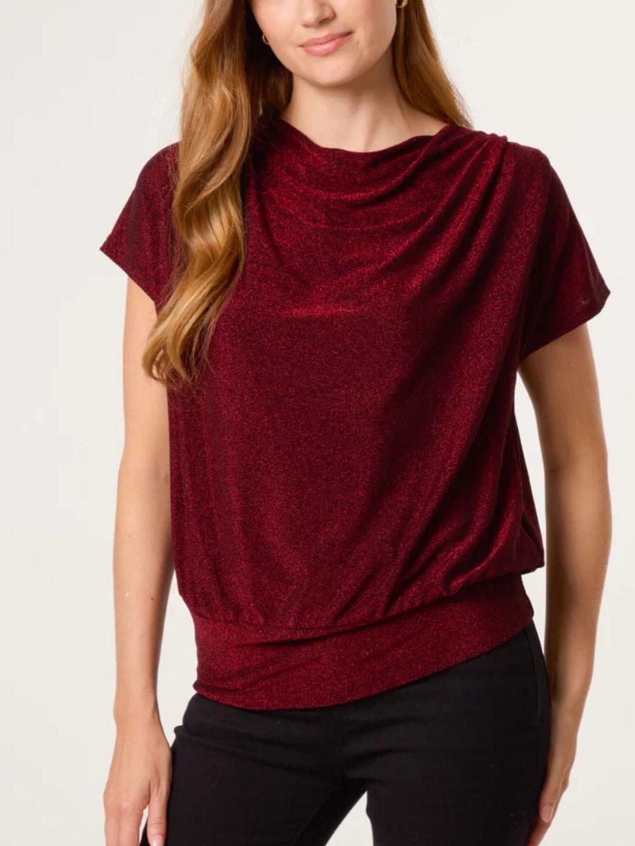 The Cowl Neck Metallic Draped Top showcases an elegant, fluid neckline that creates a flattering, softly draped silhouette. Its shimmering metallic finish adds a touch of glamour, perfect for evening events or festive occasions. Designed with a relaxed yet refined fit, it effortlessly combines comfort and sophistication.