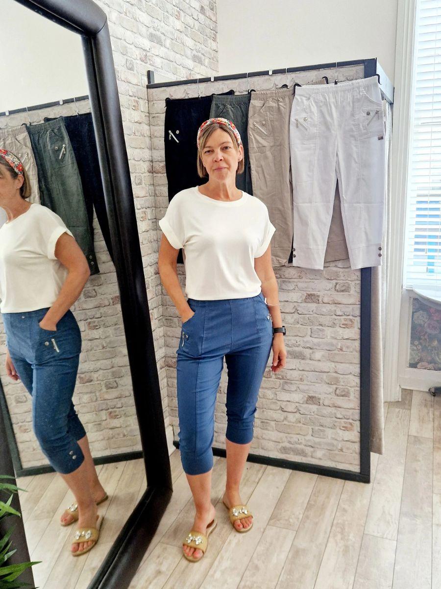 Stretch cropped trouser with button and zip details around the pocket. Leg cuff has 2 buttons to each side.