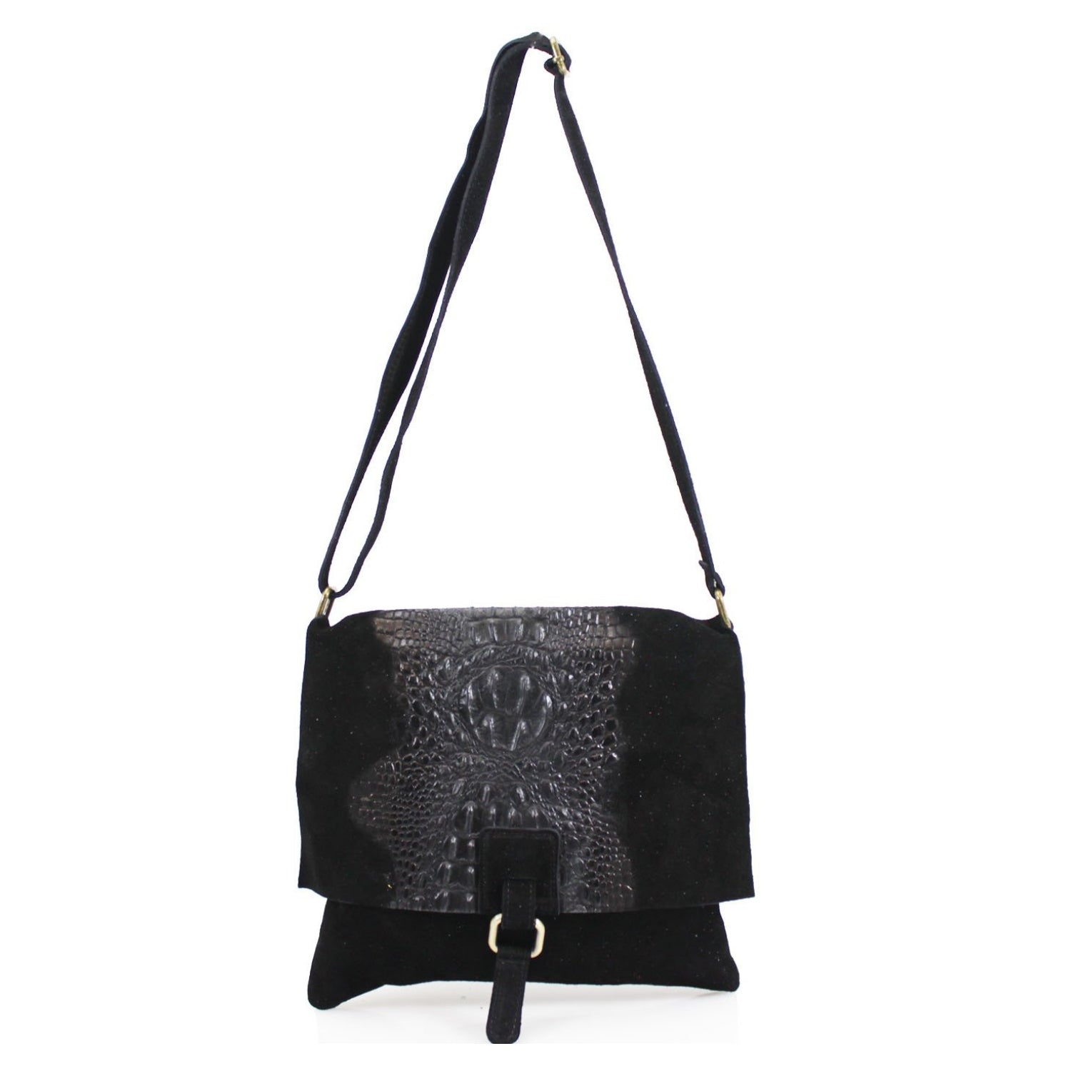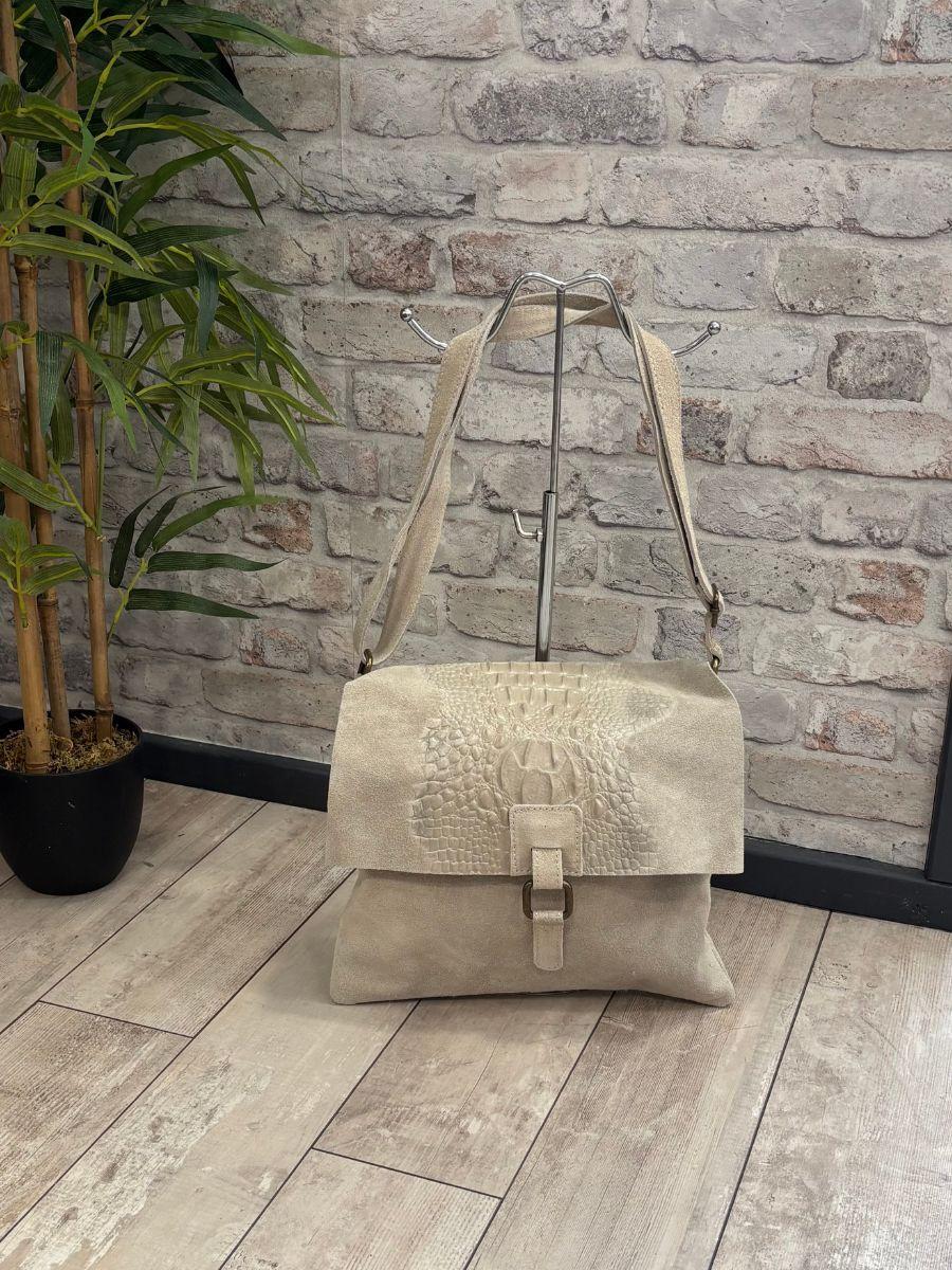 The Donna Suede Crossbody Bag blends luxury and style with its soft real suede leather and eye-catching snakeskin detail on the front. Made in Italy, it features a flap-over zipper closure, old gold-tone hardware, and both internal and external zipped pockets for added functionality. Fully lined with a 60cm handle drop, this elegant bag measures H28cm x W29cm x D4cm—perfect for refined everyday wear.
