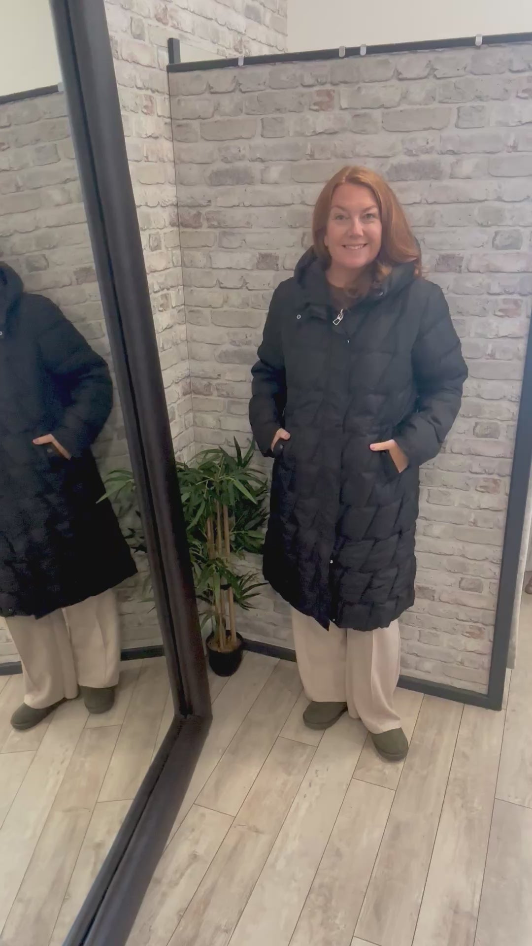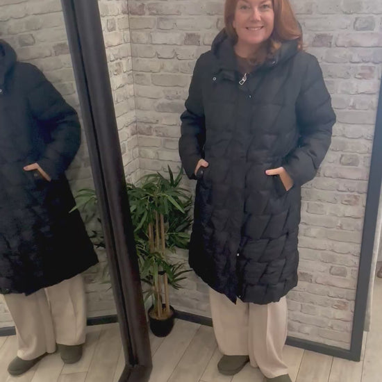 This long padded hooded coat is made from 100% polyester, offering a lightweight yet warm layer for cooler days. It features both zip and popper fastenings for extra protection against the wind. The cozy hood and sleek design make it a practical and stylish choice for everyday wear.