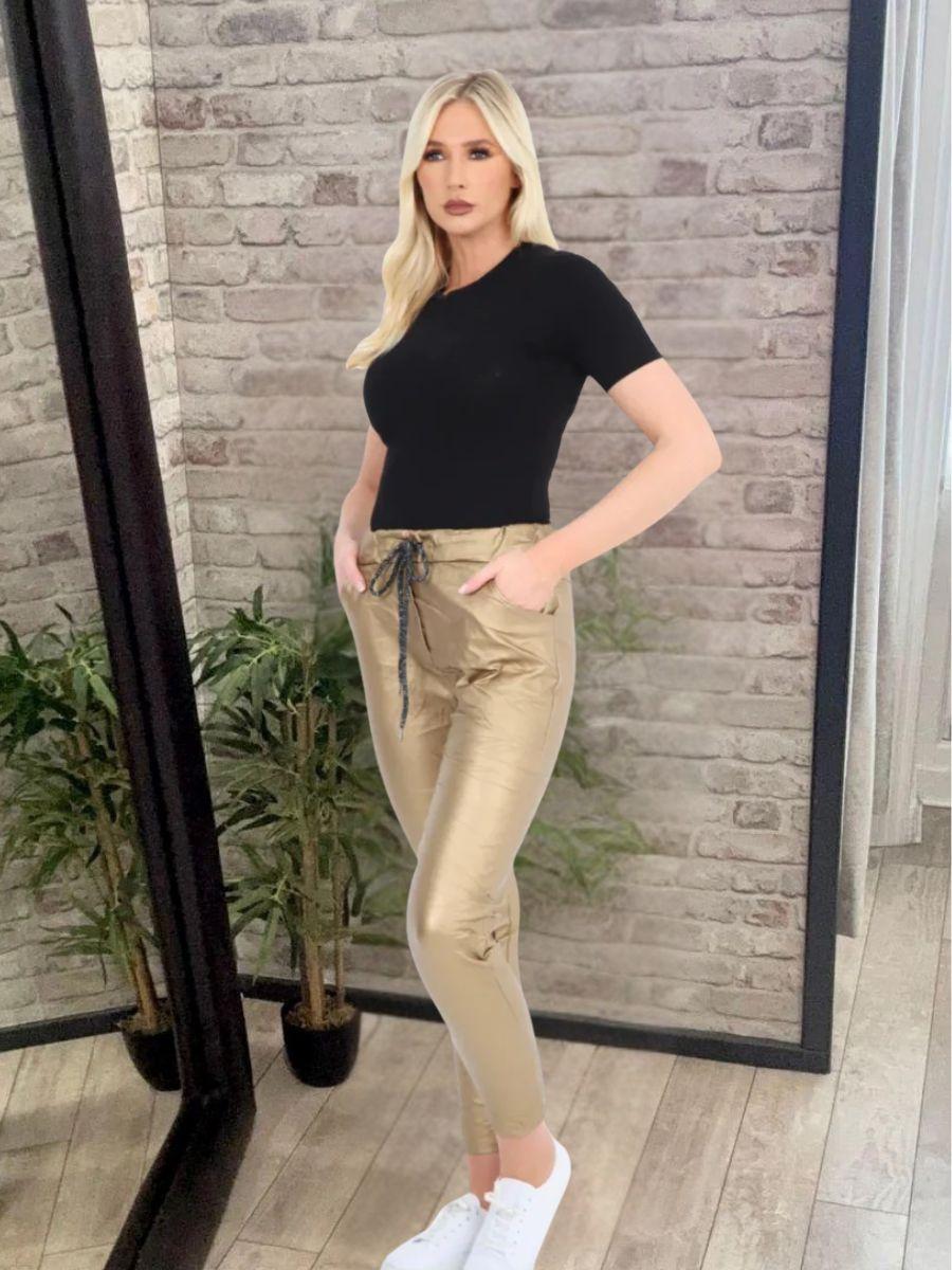 Just as comfortable as our other magic trousers with elastic drawstring waist, but with a metallic look perfect for the party season.