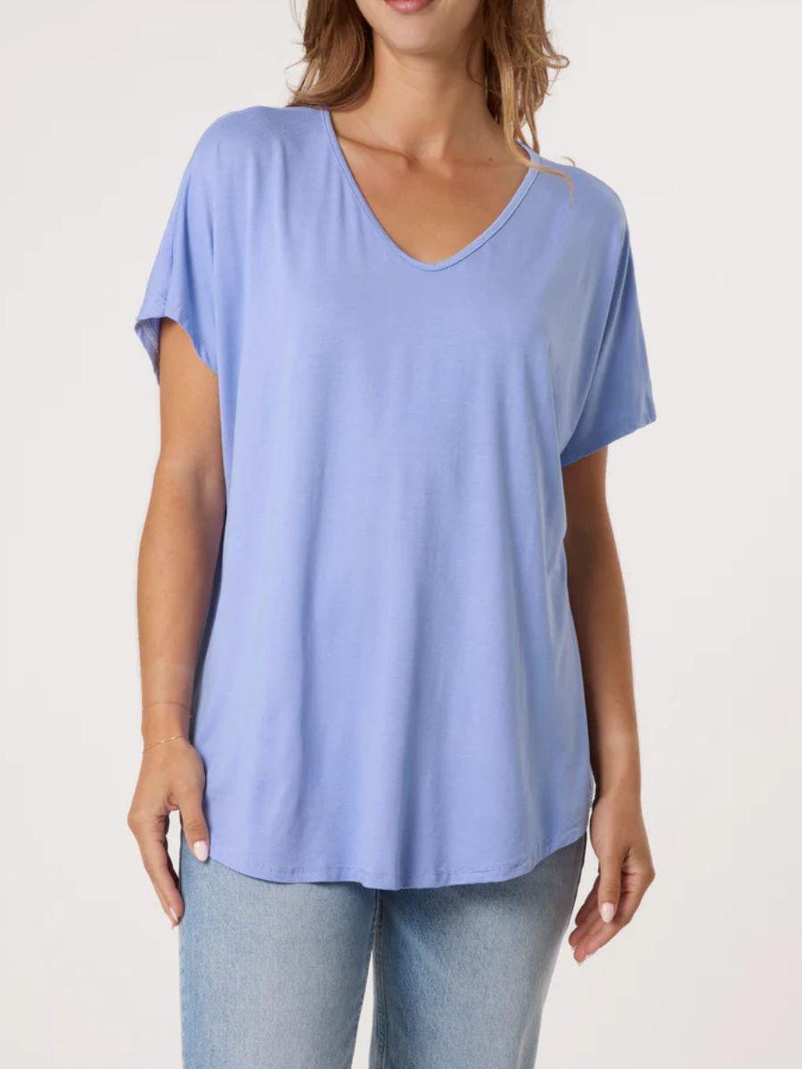 This soft V-neck plain t-shirt is a casual top that features a V-shaped neckline. It's known for its comfortable, breathable fabric and its versatility in styling. It can be paired with jeans, skirts, or shorts for a laid-back look or dressed up with accessories for a more polished outfit. A wardrobe essential.